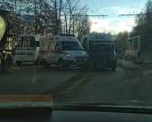 Около 11:30 возле станции переливания крови на Наугорском шоссе не смогли разъехаться машина скорой помощи и пригородная маршрутка № 354. Судя по фото, транспортные средства двигались в попутном направлении.