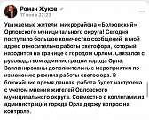 Уважаемые жители микрорайона «Болховский» Орловского муниципального округа! Сегодня поступило большое количество сообщений в мой адрес относительно работы светофора, который находится на границе с городом Орлом. Связался с руководством администрации города Орла. Запланированы дополнительные мероприятия по изменению режима работы светофора. В ближайшие время данная работа будет настроена с учетом мнения жителей Орловского муниципального округа.Но орловчане считают, что причина изменения очевидна - всем надо ехать и власти пытаются искать компромисс между участниками движения, которые часто здесь стоят в пробках. Но сделать так, чтобы всем автомобилистам на этом перекрестке было комфортно при нынешнем развитии дорожной инфраструктуры в Орле и Орловском муниципальном округе невозможно. Согласимся с мнением этого подписчика: