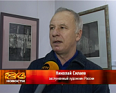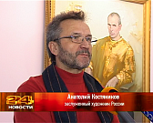 Из 60 картин, которые накануне были представлены в галерее Курнакова, трудно не заметить большой портрет кисти Анатолия Костяникова. Но это не автопортрет, здесь художник изобразил своего друга. ((Анатолий Костяников, заслуженный художник России: говорит, что собака, которая изображена на портрете сначала не хотела позировать, да и как заставить животное это сделать, она вообще засунула морду под руку своему хозяину))