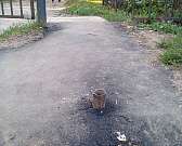 Этим летом дорожку кое-как заасфальтировали. Но посреди нее торчит из земли труба, об которую спотыкаются люди. Помимо этого, водителям закрывают обзор кусты: им не видно идущих по дорожке школьников.