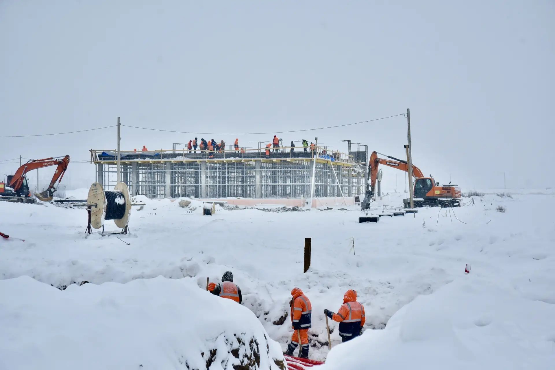 Тем не менее, строительство служебно-пассажирского здания, гаража службы спецтранспорта и аварийно-спасательной станции продолжается. Параллельно специалисты прокладывают наружные водосточно-дренажные сети.