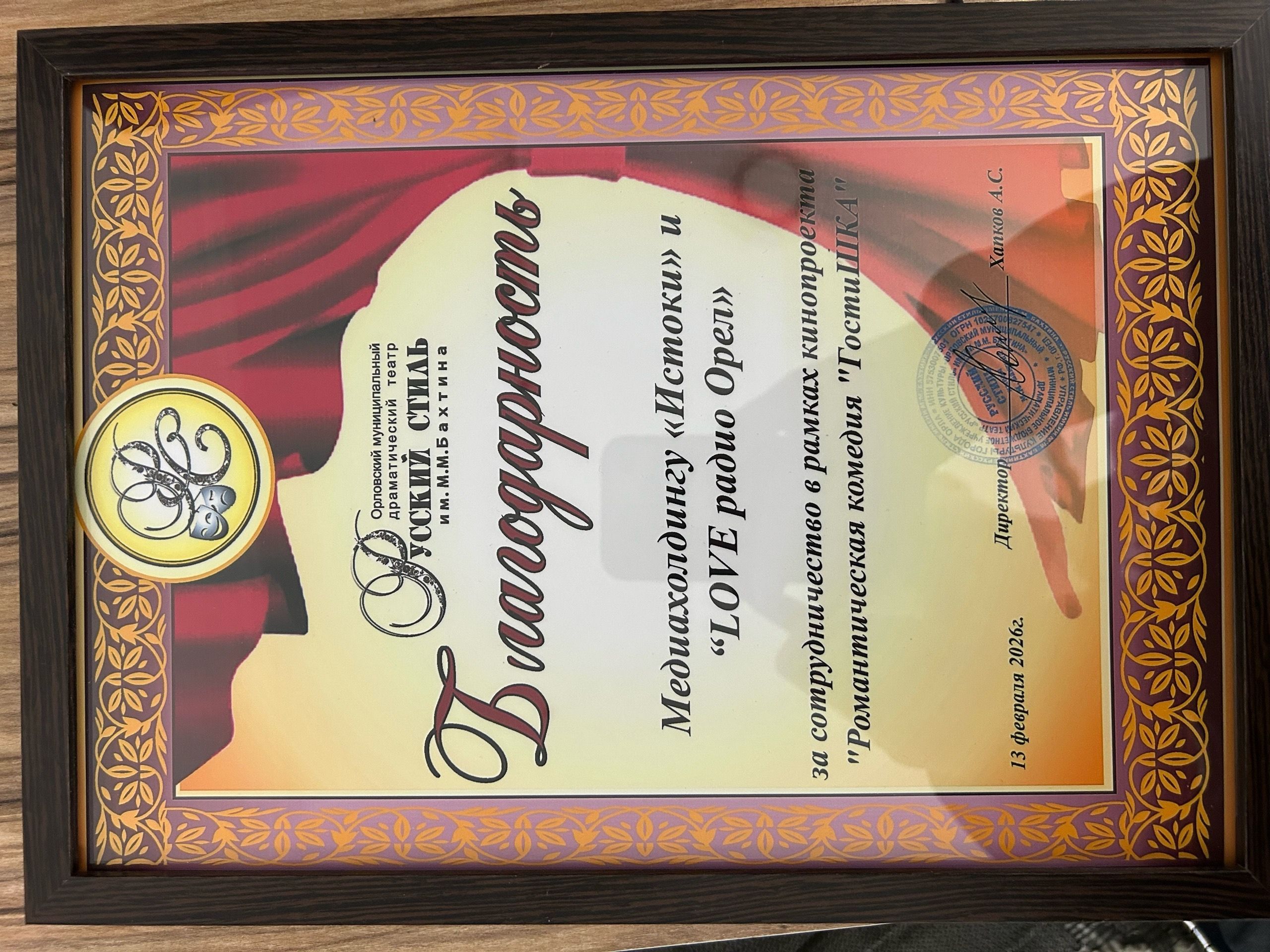 Благодарность вручали директор Орловского театра «Русский стиль» имени М. М. Бахтина Хапков А. С. и режиссёр «Романтической комедии „Гостишка“» Евгений Григорьев. Медиахолдинг «Истоки» и «LOVE радио Орёл» являлись главными информационными партнёрами проекта. Наши корреспондент и оператор даже снялись в одной из сцен фильма. Подробнее об этом расскажем в понедельник в программе «Оперативный эфир» на нашем телеканале в 19:00. Не пропустите!