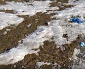 На кадрах запечатлена часть площади Жукова, с которой уже сошел снег. На газоне видны стаканчики из под кофе, использованная маска, пакет и мелкий мусор.