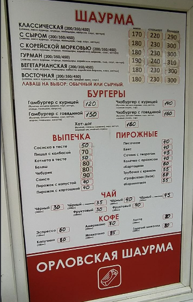 В торговой точке «Орловская шаурма» готовят популярный сейчас набор: шаурму, бургеры, сосиски в теске, пиццу, беляши, чебуреки, самсу.