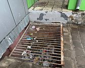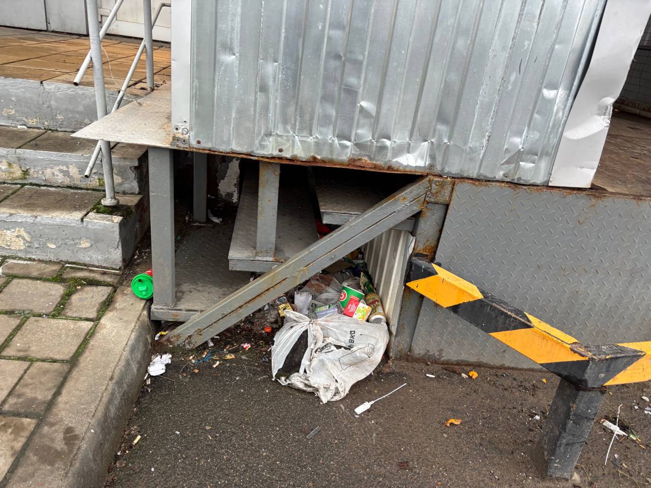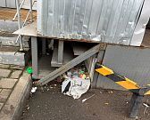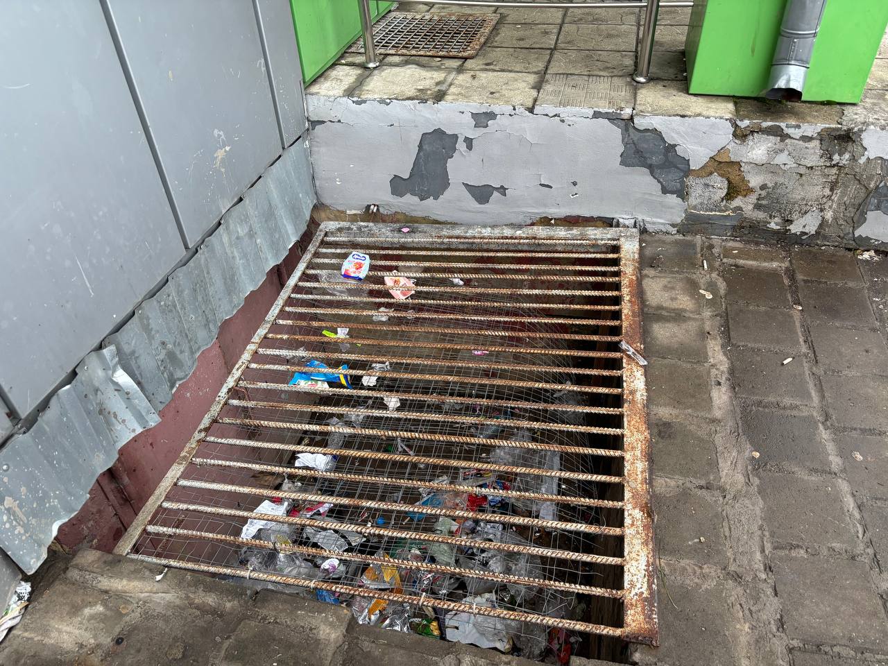 Его внешний вид напоминает большую свалку: вокруг него и в нишах разбросан мусор. Лежит он там явно не один день.